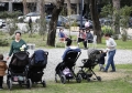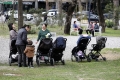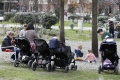 GJYSHE NE PARK ME FEMIJE - Te moshuara duke u kujdesur dhe luajtur me femije, rrethuar nga karrocat e tyre.