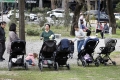 Te moshuara duke u kujdesur dhe luajtur me femije, rrethuar nga karrocat e tyre.
