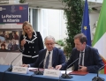 AGREEMENT BETWEEN TVSH AND RAI - The Director of International Relations at RAI, Simona Martorelli, the Delegated Administrator of RAI, Angelo Teodoli and the General Director of TVSH, Enkelejd Joti signing an agreement which foresees for the transmission of 24 programs, television series, documentaries and RAI films from TVSH channels. During the conference held on the occasion of the agreement in the premises of the Italian Residences in Tirana, there was also talk about plans for the training of TVSH staff as well as technical assistance in the digitization process of the TVSH archive.