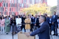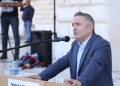 Lecturer Klodian Dhoska speaking during a protest in front of the Polytechnic Faculty of Tirana, after the lecturers boycotted the lesson even in the fourth day of the beginning of the new academic year. The lecturers continued the protest in front of the faculties from 10 am to 12 pm, demanding a 50% salary increase within two years and the improvement of academic and scientific research conditions.