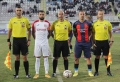 Captain of Bylis, Aleksander Trumci, Captain of Vllaznia, Erdenis Gurishta and referees of the match Adrian Beqiraj, Rejdi Zajimi and Rexhep Muzhaqi during the football match, Vllaznia of Shkodra vs Bylis of Ballshi, 2-1, valid for the Albanian Super League, played at the Loro Borici in Shkodra.
