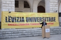 Lecturer of the Faculty of Arts, Ardian Isufi during a protest in front of the Polytechnic Faculty of Tirana, after lecturers boycotted the lesson even in the sixth day of the beginning of the new academic year. The lecturers continued the protest in front of the faculties from 10 am to 12 pm, demanding a 50% salary increase within two years and the improvement of academic and scientific research conditions.