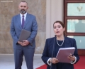 Minister of State for Youth and Children, Bora Muzhaqi and Minister of Justice, Ulsi Manja speaking in front of the Prime Minister's office, after a government meeting, in regards to the approved decisions.