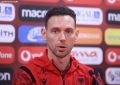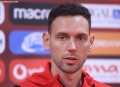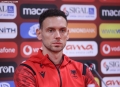 The goalkeeper of the Albanian national football team, Ertriti Berisha, speaking at a conference before the match between the national team and the Italian national football team at the Air Albania stadium.
