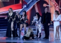 member of the jury, Jonida Maliqi, the hosts of the festival, Ardit Gjebrea and Olta Beqiri and the Italian group La Deva, which was announced as the winner in the Big International category during the 23rd edition of the Kenga Magjike festival, organized in the premises of the Palace of Congresses. While receiving the trophy, one of the members of the group fell. During this edition, the artists competed in four categories, Big International, New International, New Artist and Big Artist, which was the main award of the festival.