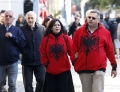 A couple dressed in the colors of the Albanian flag walking on Luigj Gurakuqi street on the occasion of the national holidays of November 28 and 29. This year celebrates the 110th anniversary of Albania's Independence.