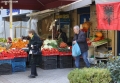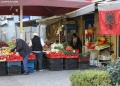 Albanian flags near a fruit and vegetable shop on the occasion of the national holidays of November 28 and 29. This year celebrates the 110th anniversary of Albania's Independence.