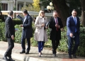 MPs Ervin Salianji, Flamur Noka, Ina Zhupa, Luan Baci and Belind Kellici leaving the parliament hall after a parliamentary session where German President Frank-Walter Steinmeier gave a speech. Steinmeier's visit to Albania comes as a result of his Balkan tour and is the first visit of a German president to Albania in 27 years.