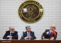Chairman of the Academy of Sciences and Arts of Kosovo, Mehmet Kraja, Chairman of the Academy of Sciences, Skender Gjinushi, Academic Shaban Sinani, speaking during a press conference of the Academy of Sciences, in which the members of the central editorial office for the Albanian Encyclopedia were announced.