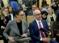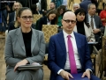 The Minister of Finance and Economy, Delina Ibrahimaj and the President of the American Chamber of Commerce, Enio Jaco, during a conference regarding the future of the workforce and its departure from Albania. The conference was organized by Monitor Magazine and the American Chamber of Commerce.