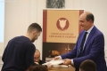 Head of the Constitutional Court Vitore Tusha and one of the winners of the competition Kevin Dervishaliaj during a meeting held in the framework of a competition organized by the OSCE in the field of law. The competition held had as its subject the drafting of an individual constitutional complaint and was held in several universities in Albania.