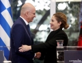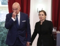 CONFERENCE OF XHACKA AND DENDIAS - The Greek Foreign Minister, Nikos Dendias, and the Minister for Europe and Foreign Affairs, Olta Xhacka pose after a joint press conference. During the conference, the ministers spoke about the issue of the sea, the intensification of relations between the two countries, the energy crisis and the war in Ukraine.