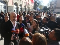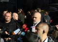 Prime Minister Edi Rama, surrounded by police forces speaking to the media after the presentation ceremony for the project of the new national theater, which was also attended by the mayor of Tirana, Erion Veliaj. The new theater, designed by the Danish architect Bjarke Ingels, will be built in the place where the old theater stood. The destruction of the theater and the project have met with protests and resistance from artists and citizens.