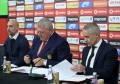 AFF President Armand Duka and brazilian Sylvio Mendes Canpos Junior (Sylvinho) sign the contract during the presentation ceremony of Sylvinho as the new coach of the National Football Team of Albania, while Guidoni and Zabaleta will be assistant coaches. Sylvinho replaces the Italian Edoardo Reja and has signed an 18-month contract.