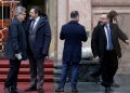 The Minister of the Interior, Bledar Cuci, and Deputy Benet Beci coming out of the meeting of the Parliamentary group of the SP, where each of the ministers and deputies handed over the envelopes with the three names they propose as candidates for the new president of the Republic.