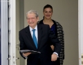 Democratic Party spokesman Floriana Garo and leader of the Democratic Party, Sali Berisha, entering a press conference, where he commented on the transcript of a conversation between Guard guards on January 21, 2011, calling Prime Minister Edi Rama, at that time the opposition leader, the main responsible for the events of that day.