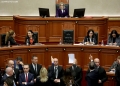 Opposition MPs in a moment of tension during a parliamentary session. During this session, the MPs requested an interpellation with Prime Minister Edi Rama regarding the McGonigal case, insisting that they would not continue the session if it was not carried out.