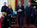 MPs Tritan Shehu, Luciano Boci and Albana Vokshi leaving a parliamentary session, where the opposition MPs requested an interpellation with Prime Minister Edi Rama regarding the McGonigal case, insisting that they would not continue the session if it was not carried out.