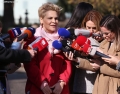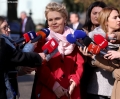 MP Monika Kryemadhi speaking to journalists outside the parliament building after a session, where the opposition MPs requested an interview with Prime Minister Edi Rama regarding the McGonigal issue, insisting that they would not continue the session if it was not carried out.