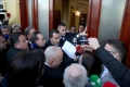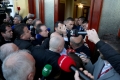 MPs Luciano Boci, Luan Baci and Bledjon Nallbati talk to the media after they were not allowed to enter the parliament, after they were excluded a few days ago for 10 days. Members of the Guard of the Republic tried to stop them while journalists tried to broadcast the words that were said.