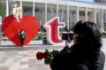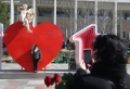 A man poses while being photographed in a decoration in Skanderbeg square in Tirana, on the occasion of Valentine's Day.