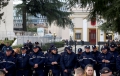 The Republic Guard forces standing in front of the parliament during an opposition protest. In the protest called by Berisha, who along with 14 other MPs of the democratic party have been expelled from the parliament, appeals were made to the Appeals court regarding the case of the logo and seal of the Democratic Party. During the protest, Berisha said that if the verdict was not in favor of his group, he and the protesters would march towards the house of Prime Minister Edi Rama.