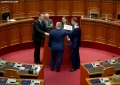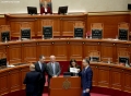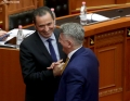 MPs Isuf Celaj and Agron Gjekmarkaj speaking during a parliamentary session where there were debates between the majority and opposition MPs regarding the absence of Prime Minister Edi Rama. The opposition MPs accused the Speaker of the Parliament, Lindita Nikolla, of constantly breaking the rules, while they demanded to talk about the McGonigal issue, despite the fact that Prime Minister Edi Rama has been on an official visit to Japan for several days.