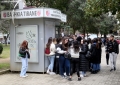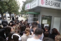 Students waiting in line at a counter to receive monthly student passes for city bus lines in Tirana. Students have complained that by being forced to be present themselves to get the passes, they lose classes.