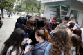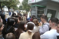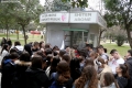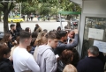 STUDENTS WAITING IN LINE FOR PASSES - Students waiting in line at a counter to receive monthly student passes for city bus lines in Tirana. Students have complained that by being forced to be present themselves to get the passes, they lose classes.