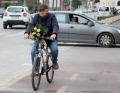 MARCH 8 IN TIRANA - A man with a bouquet in a bicycle basket on a street in Tirana on March 8, International Women's Day.