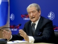 Former Prime Minister, Sali Berisha and the head of the Press Office of the Democratic Party, Alfred Lela speaking in a press conference in the premises of the blue headquarters. During his speech, Berisha said that he would enter the election in a coalition with the freedom party of Ilir Metes and repeated that he would not cooperate with Enkelejd Alibeaj.