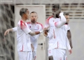 Vllaznia players celebrate scoring a goal during the football match, Vllaznia of Shkodra vs Partizani, 1-1, valid for the Albanian Super League, played at the Loro Borici stadium in Shkodra.