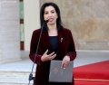 Minister of Tourism and Environment, Mirela Kumbaro speaking at a press conference in front of the Prime Minister's office, after a meeting of government, regarding the approved decisions