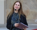 Minister of Education and Sports, Evis Kushi speaking at a press conference in front of the Prime Minister's office, after a meeting of government, regarding the approved decisions