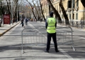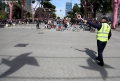 A policeman is standing on Mylsym Shyri street while traffic queues have been created as a result of road closures as a result of summer day celebrations.