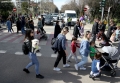 Citizens walking on the Deshmoret e Kombit boulevard, while traffic queues have been created as a result of the boulevard being blocked during the Summer Day celebrations.