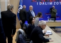 Former Prime Minister Sali Berisha entering in a meeting with members of the DP parliamentary group, the supporter of his grouping, in the blue headquarters. He attacked Prime Minister Edi Rama and spoke about the finalization of the coalition for the May 14 local elections.