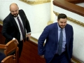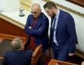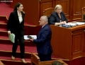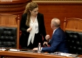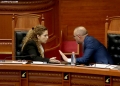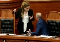 Minister of Health and Social Protection Ogerta Manastirliu and MP Bujar Leskaj in a parliamentary session. During this session, deputies Belind Kellici and Luciano Boci gave up their mandate to run for the municipalities of Tirana and Elbasan, respectively, in the May 14 elections.