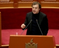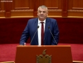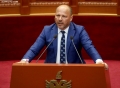 MP Xhelal Mziu speaking in a parliamentary session. During this session, deputies Belind Kellici and Luciano Boci gave up their mandate to run for the municipalities of Tirana and Elbasan, respectively, in the May 14 elections.