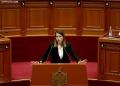 Deputy Prime Minister and Minister of Infrastructure and Energy, Belinda Balluku speaking in a parliamentary session. During this session, deputies Belind Kellici and Luciano Boci gave up their mandate to run for the municipalities of Tirana and Elbasan, respectively, in the May 14 elections.