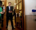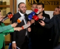 Agron Gjekmarkaj coming out of a meeting of the leadership of the Democratic Party and with the parliamentary group, held in the new headquarters of the DP. DP members spoke about the May 14 local elections, while Alibeaj said that the decisions will be formalized soon.