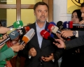 The chairman of the parliamentary group of the DP, Enkelejd Alibeaj, coming out of a meeting of the leadership of the Democratic Party and with the parliamentary group, held in the new headquarters of the DP. DP members spoke about the May 14 local elections, while Alibeaj said that the decisions will be formalized soon.