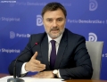 The chairman of the DP parliamentary group, Enkelejd Alibeaj speaking a press conference at the new headquarters of the democratic party. Alibeaj presented Roland Bejko (mayor) and Enriketa Papa (municipal council) as candidates for Tirana, while talking about the possibilities in the May 14 elections, as they will face not only the SP candidates, but also the group that supports Sali Berishen.