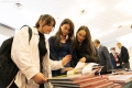Students and citizens reading brochures before the national sports conference Achievements and Challenges of Sport in Albania. During the conference, the participants appreciated the Albanian athletes for their achievements and talked about the steps that should be taken to develop this field.