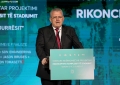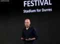 President of the AFF Armand Duka speaking during a ceremony held in the framework of the international competition for the new stadium of the city of Durres. The winner was the Belgian company 51N4E, which will design the stadium as a modern complex which will have training fields, basketball courts and swimming pools. The Belgian studio 51N4E, which won against studios Bjarke Ingels Group, BIG (Denmark) and MVRDV (Holland), is the same studio that designed Skanderbeg Square.