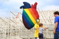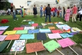 Signs and banners placed on the ground before the Tirana Gay Pride parade, to mark the International Day Against Homophobia, Transphobia and Biphobia in Tirana on May 20, 2022.