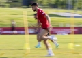 The player of the Albanian national football team, Naser Aliji during a training session in the fields of the Football House before the two official matches of the qualifiers for Euro 2024 against Moldova and the Faroe Islands.