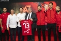 Players of the Albanian national football team, Elseid Hysaj, Amir Abrashi and Ertrit Berisha during a promotion ceremony for Ansi Agolli's documentary Historia Ime at the FSF premises, produced by journalists Elvis Rexha and Glenti Nallbani. The documentary shows his career and his personal story.