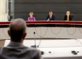 The Judicial Panel Lulzim Hamitaj, Valbona Sanxhaktari and Genta Tafa Bungo during a session of the Independent Qualification Commission, IQC, with the prosecutor in the Prosecutor's Office at the Tirana Judicial District Court, Ylli Bashaj, who in the given decision characterized him as a clean figure at the end of the transitional re-evaluation process, otherwise known as the vetting process. Bashaj passed the three evaluation pillars, the professional side, wealth and integrity.