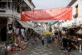 Citizens in Qafa e Pazarit area before the start of the Folklore Festival of Gjirokastra. The festival will be held for 8 nights in the castle, on a stage open to all.